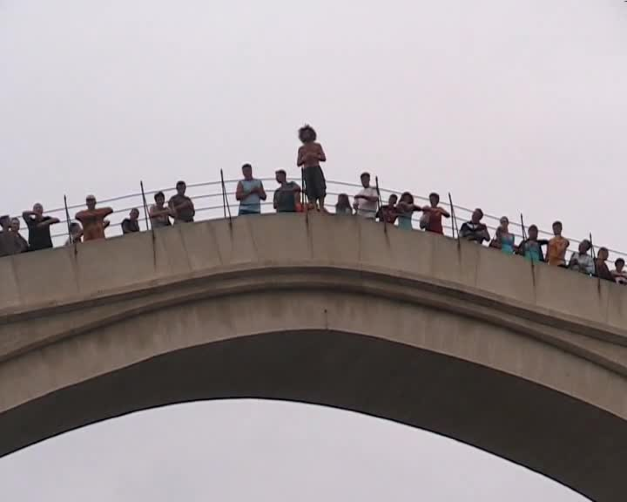Auf der im Krieg zerstörten, 1995 - 2004 von der UNESCO wieder aufgebauten Brücke über die Neretva stolziert ein Mann nur mit Badehose bekleidet vor den Touristen auf und ab, greift sich immer wieder in die langen, wuscheligen Haare, stellt sehr selbstbewusst seinen Körper zur Schau. Er steht auf der Brüstung der Brücke, höher als die Touristen, von denen er Geld sammelt und die seinen Körper bewundern. Später springt er von der Brücke, 27 Meter tief in die eiskalte Neretva.