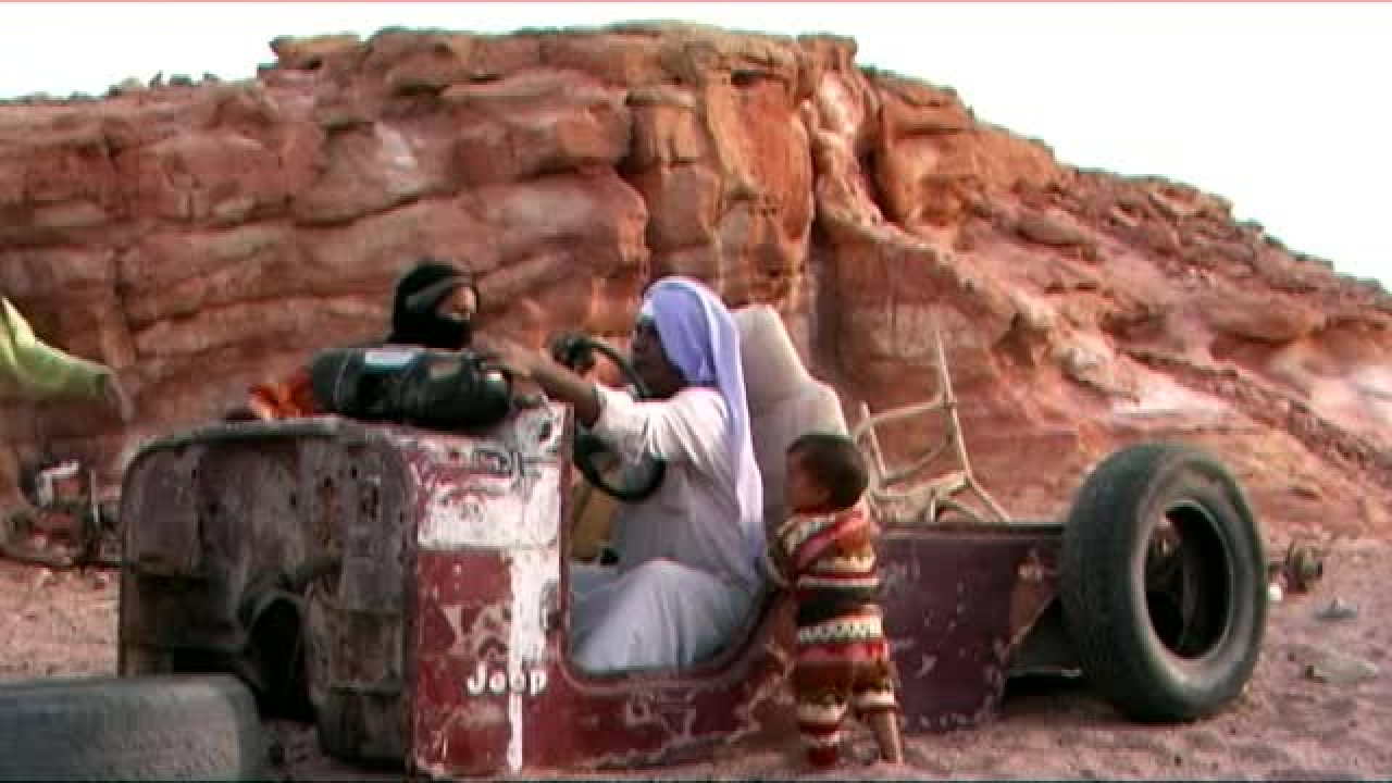 Eine Beduinenfamilie und ein Jeepwrack setzen sich in Bewegung.