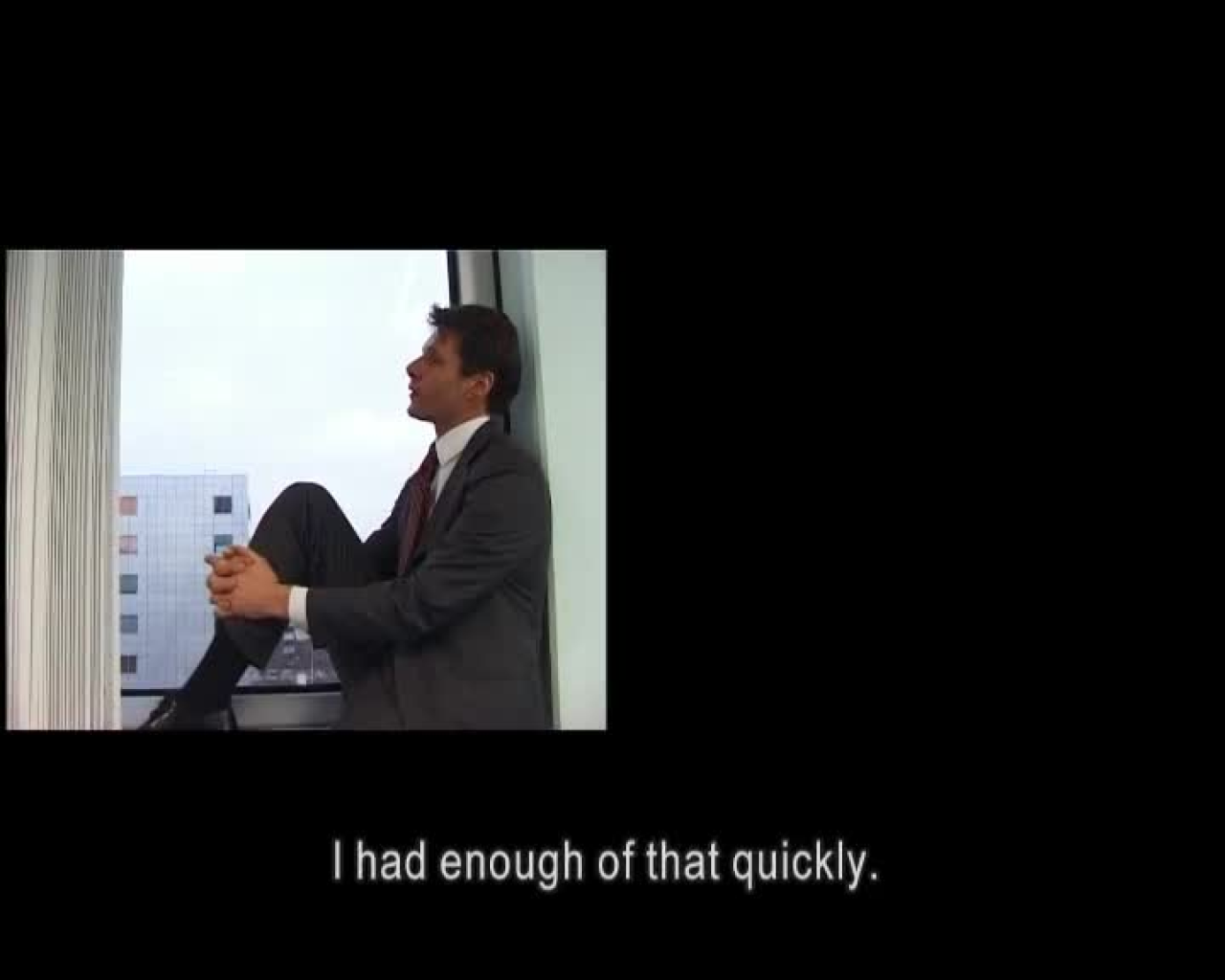 I selected five men for the video: a lawyer, a spin-doctor, a media advisor, a millionaire and a top manager. They are filmed pacing around in a generic office space, that was specially constructed for the video. While they appear talking to themselves, they are in fact responding to questions I am asking them over a hands-free phone. In their “monologues” they talk about the importance and omnipotence of money.